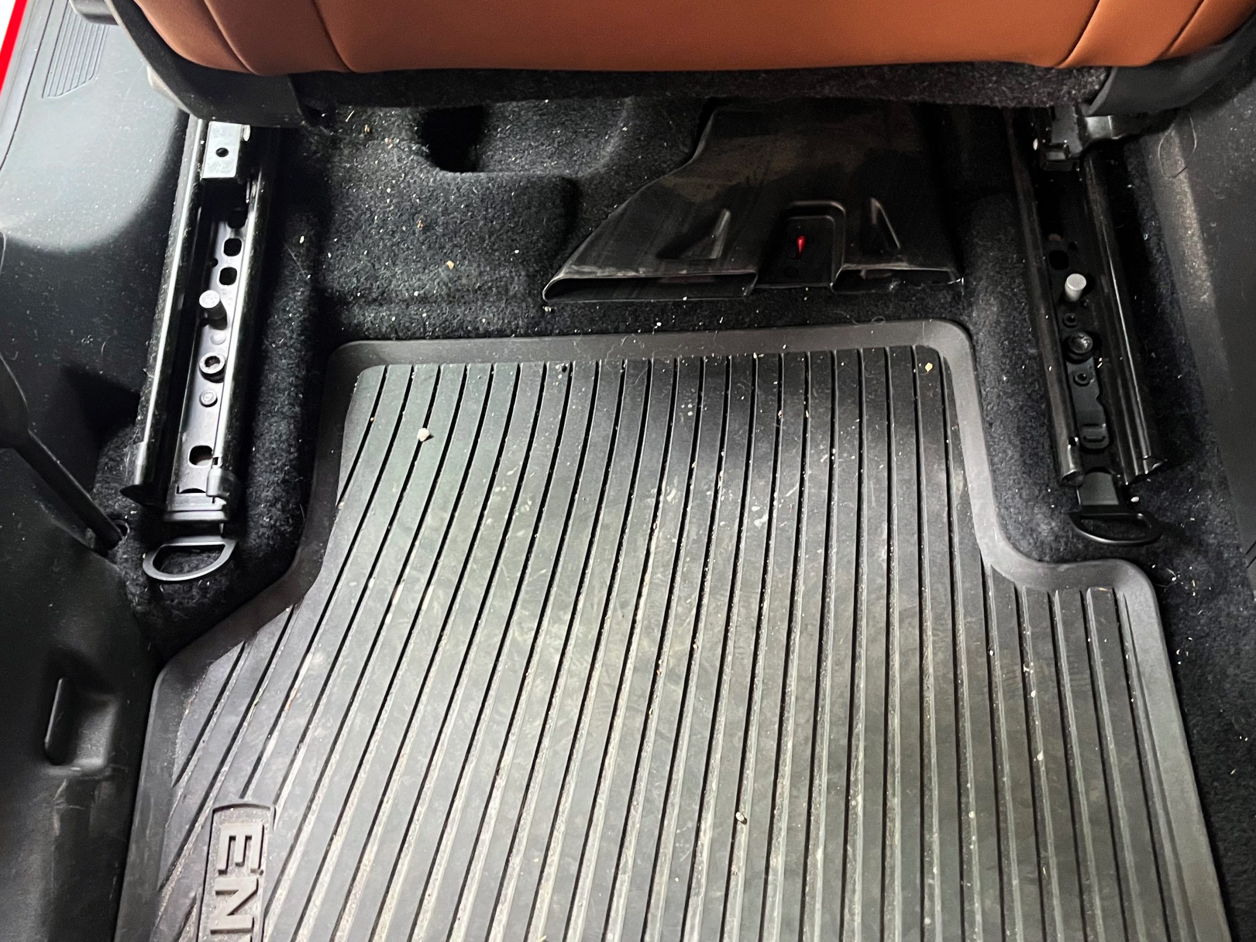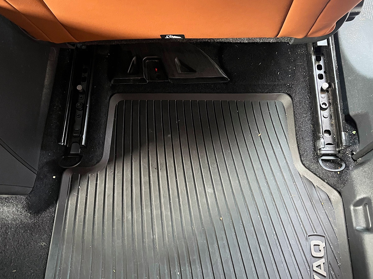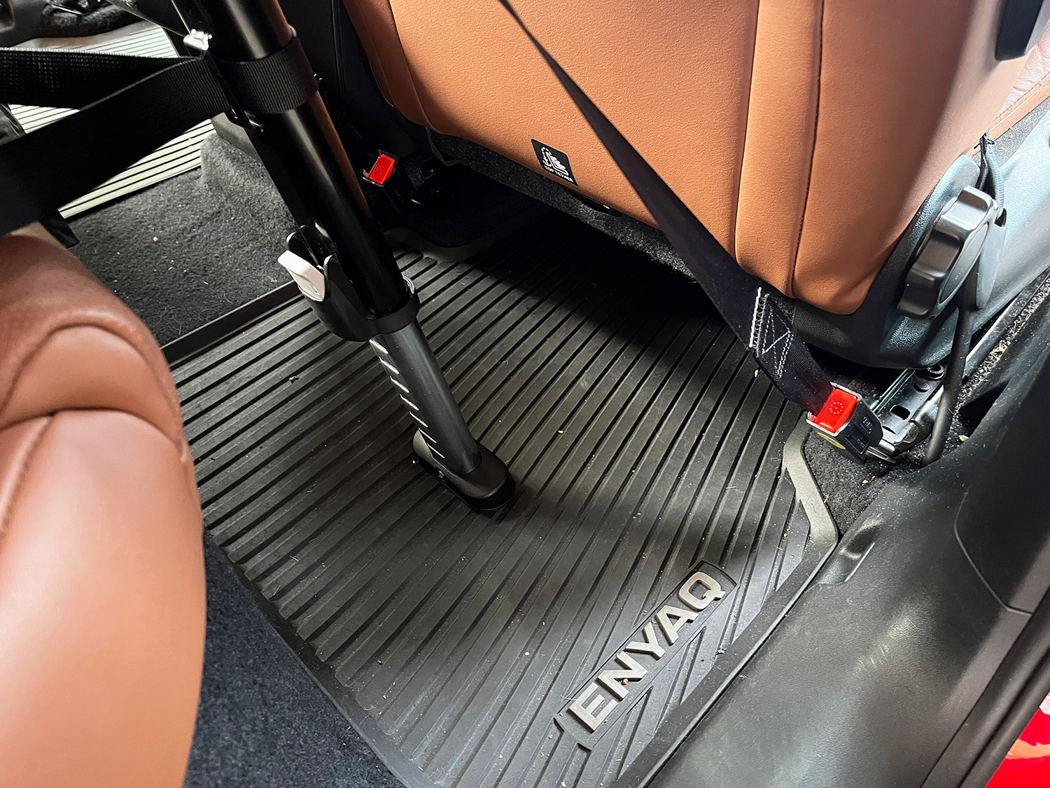 Vilka öglor ska användas? Dagens bil är en Skoda Enyaq som har samma platta som Volkswagen, Seat och Audi. Där monterar vi alltid extra långa öglor bak och långa öglor (eller ibland korta) öglor fram. I dessa bilar monterar vi alltid öglorna under glidskenorna i baksätet. När man monterar fram monteras en av öglorna ovanpå skenan. Tesla är ett undantag. Det är som sagt extremt svårt att fästa förankringsbanden och när man monterar öglor görs det med extra långa öglor bak och långa framtill. Dock alltid ovanpå glidskenorna.