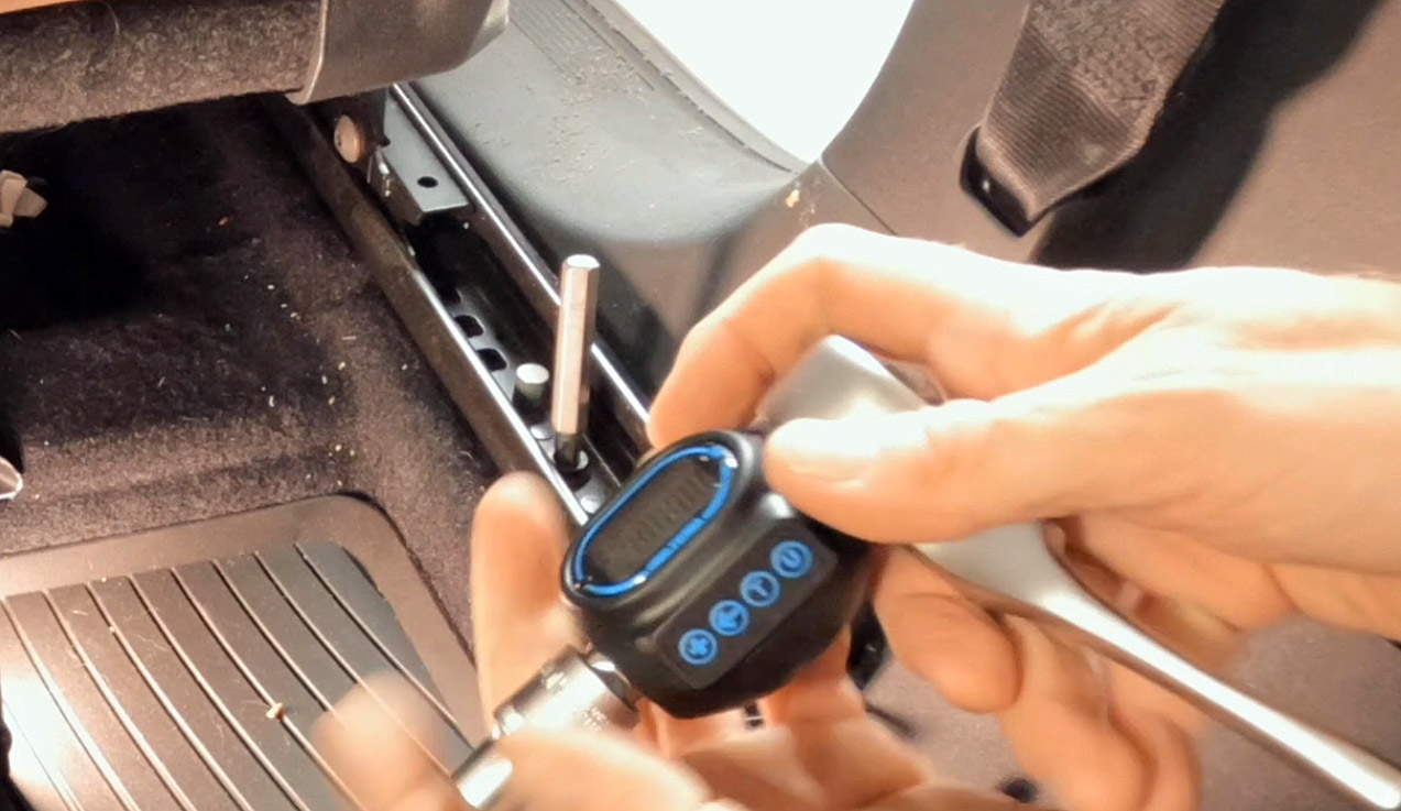 4. Drag åt bulten: Skjut in öglan ordentligt och skruva bulten med handkraft så att den inte vildgängas. Fortsätt sedan och använd spärrskaftet med samma hylsa som tidigare. Nu vill vi dra åt bulten med rätt kraft (moment) och då använder man en momentnyckel. Vi föredrar en digital momentnyckel men det går lika bra med en analog. Man använder detta verktyg så att kraften på bulten blir korrekt. En ovan användare skulle teoretiskt kunna dra åt bulten alldeles för löst eller så hårt att bulten knäcks. När man skruvat i motorcyklar, snöskotrar, traktorer, bilar, cyklar, båtar, gräsklippare, motorsågar och annat har man rätt bra känsla för vad som är korrekt kraft och momentnyckel kan kännas lite onödigt. Vi rekommenderar dock att det alltid används.