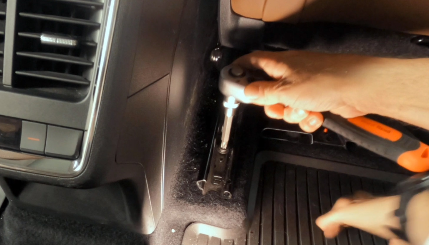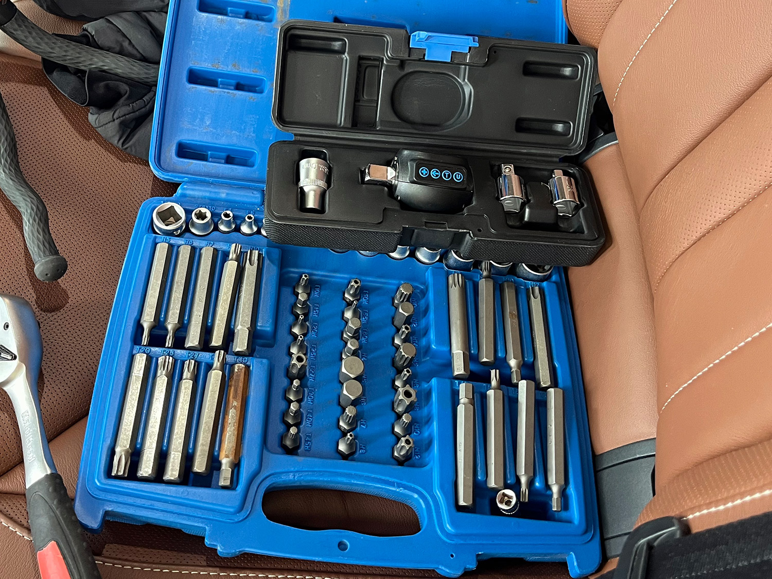 1. Välj rätt verktyg: Vi har ett set med Torx och kan hantera alla bilar. Det är viktigt att korrekt hylsa väljs annars kan bulten “vildgängas” och förstöras. Vi använder sedan ett spärrskaft för att lossa och dra åt bulten. Hjälpsamt att även ha en skruvmejsel tillgänglig. Det krävs inte mycket kraft varken för att lossa eller dra åt bulten. Det klarar till och med en vegansk Miljöpartist. När bulten dras åt använder vi en digital momentnyckel för att få rätt kraft. Mer om detta längre ned.